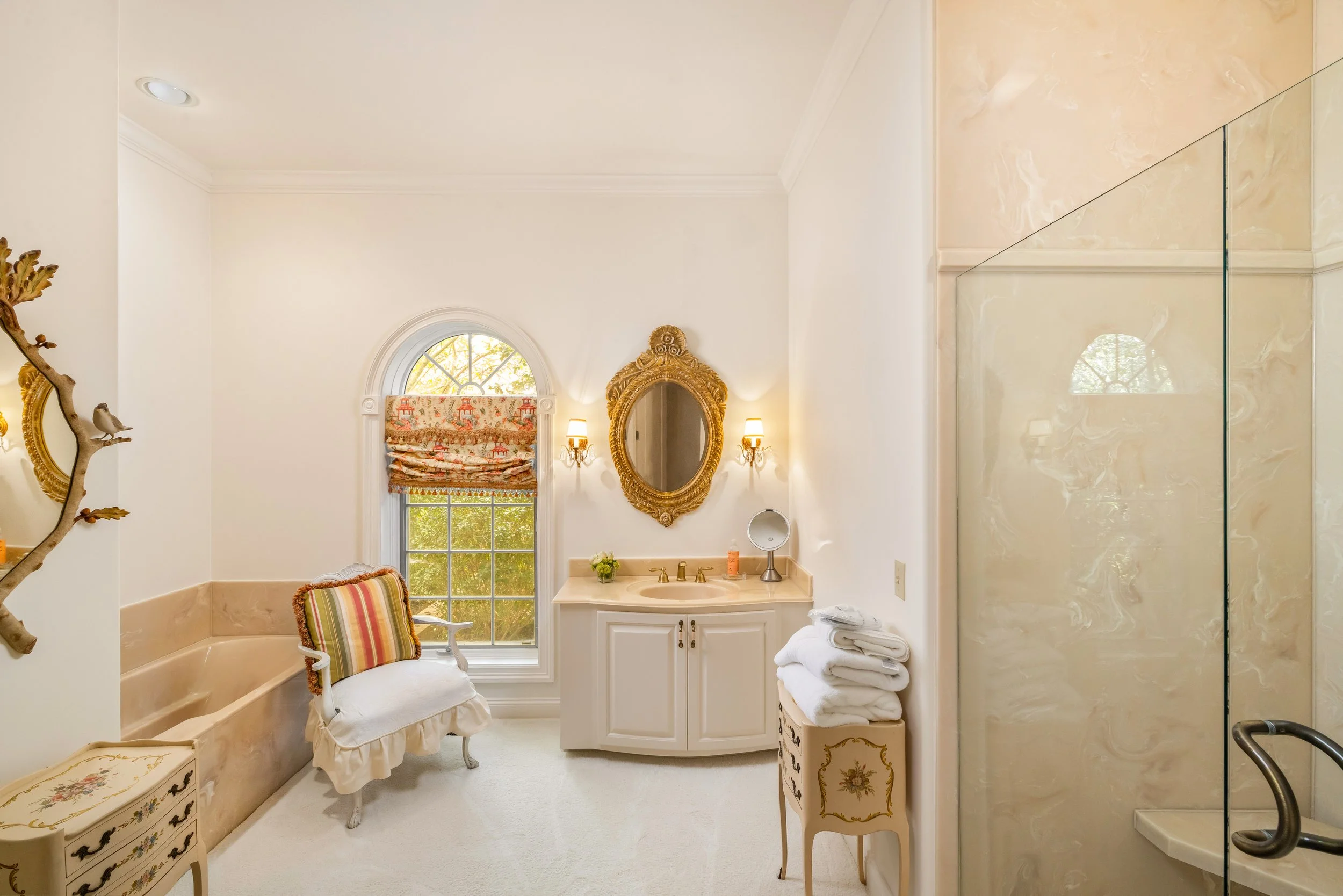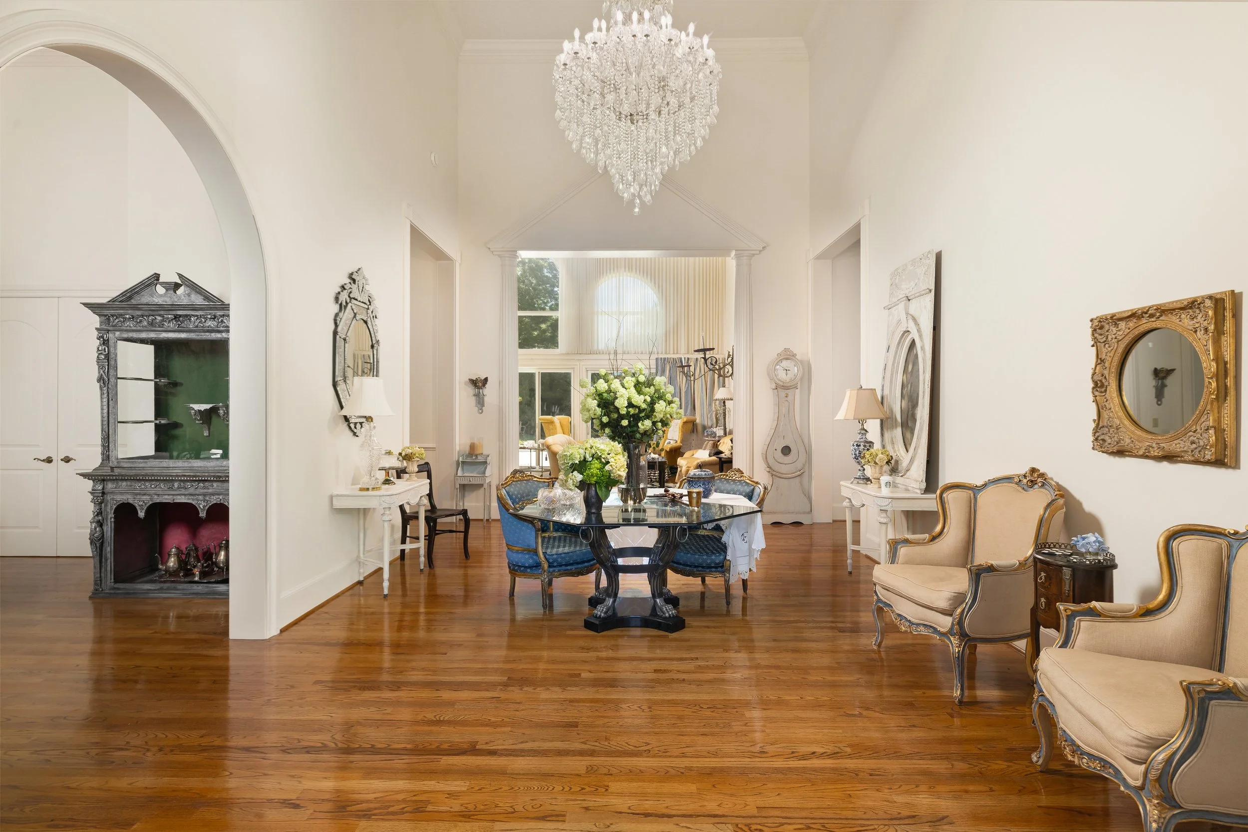 From the moment you pass through the gates and approach the circular drive framed by a bronze fountain, every detail evokes elegance. The grand front porch opens to a soaring foyer with 20-foot ceilings, bathing the interiors in natural light.