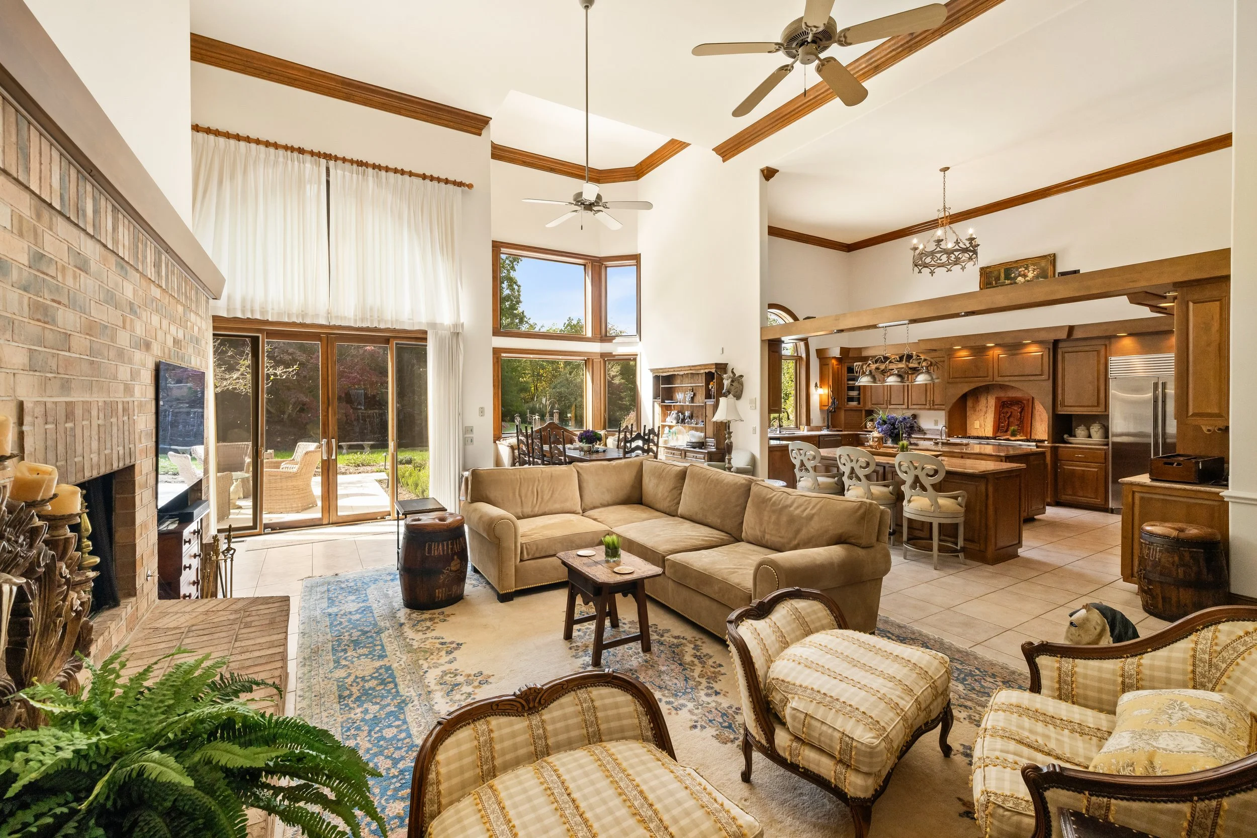 The gourmet chef’s kitchen features a Sub-Zero refrigerator, gas range with custom hood, large island with prep sink, and a sunlit breakfast room overlooking the waterfall. It seamlessly connects to a warm great room with a fireplace and wet bar.