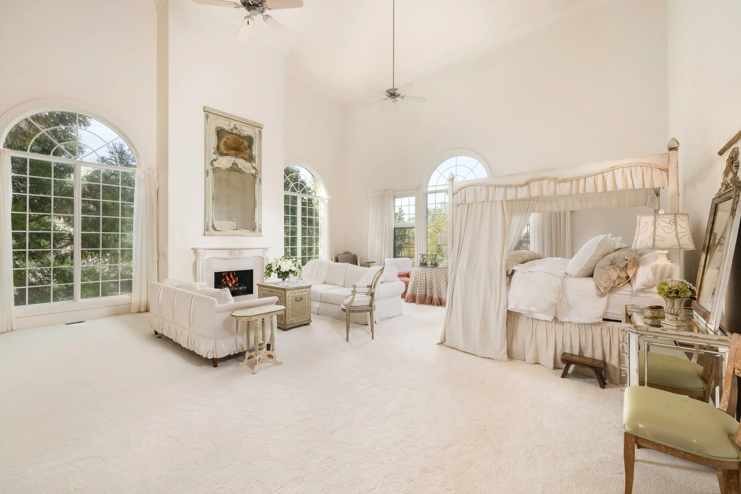 A true sanctuary with its own fireplace, built-ins, dual custom closets, and a spa-inspired bath featuring cultured-marble vanities, jetted tub, and walk-in shower. Each additional bedroom offers a private ensuite.